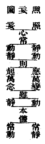 古云:"常灭动心,不灭照心。"一切不动之心皆照心也,一切不止之心皆妄心也。照心即道心也,妄心即人心也。"道心惟微",谓微妙而难见也。"人心惟危",谓危殆而不安也。虽人心亦有道心,虽道心亦有人心,系乎动静之间尔。惟"允执厥中"者,照心常存,妄心不动,危者安平,微者昭著,到此无妄之心复矣,无妄之道成矣,《易》曰:"复,其见天地之心乎?"